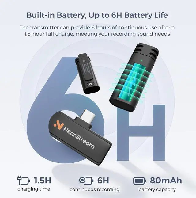 6H Battery Life & Stable Transmission: The transmitter features a built-in 80mAh rechargeable battery that provides up to 6 hours of usage on a single 1.5 -hour charge, making it ideal for outdoor activities, vlogging, and livestreaming. The wireless lapel microphone utilizes 2.4GH z wireless transmission with ultra-low latency, ensuring real-time audio synchronization. It offers a stable range of up to 33ft (10m) in open, unobstructed environments.