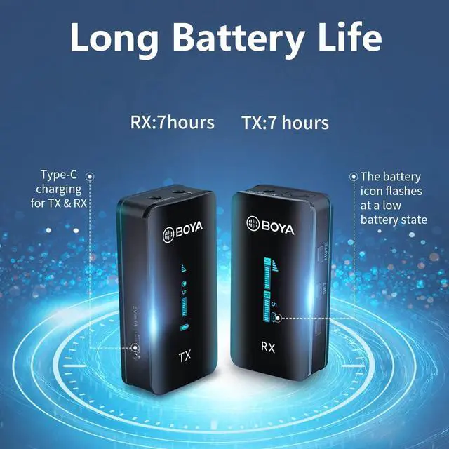 Long Battery Life -- Professional Audio Capturing & Delivering--Featuring a high-quality capsule and signal processing circuit. Built-in rechargeable lithium battery, can work continuously for 7 hours. Type-C interface, support on-the-go charging, no stress during the whole day of shooting.