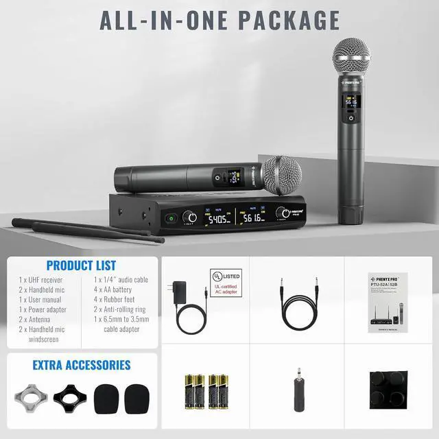 BOX CONTENTS: 1 x UHF receiver, 2 x wireless mics, 1 x power adapter, 1 x 1/4 audio cable, 1 x 6.35 mm to 3.5 mm adapter, 4 x AA batteries, 1 x user manual, 2 x anti-rolling rings, 2 x handheld mic windscreens, 2 x antennas, 4 x rubber feet