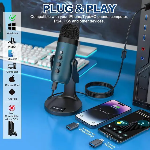 Easy Plug&Play Setup This USB gaming microphone for computer is ready to use with Computer, Laptop, Mac OS, PS4, and PS5 right out of the box. Connect it easily to your iPhone, Type C Phone, iPad, or Android Tablet using the included USB IPHONE ADAPTER and Type C to USB adapter. With this plug-and-play gaming streaming microphone set and podcast equipment bundle, there' s no need for additional setup steps. It' s simple to start creating video content and engage with platforms.