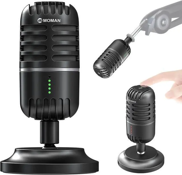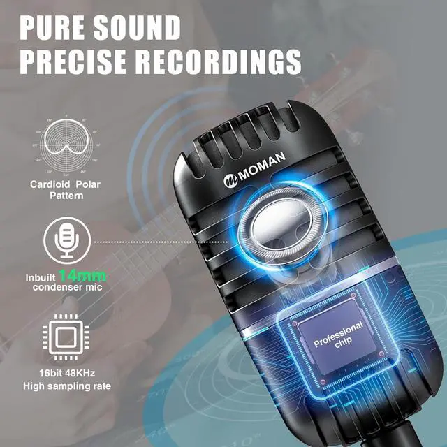 Powerful Microphone Made CompactInstead of wiring all over your desktop, Moman EMP USB Mic is designed with compact size to give you a clean space, yet powerful enough to pickup your sound both on your desk or connect with a boom arm through 3/8 thread, thanks to cardioid pattern only focusing on your voice.