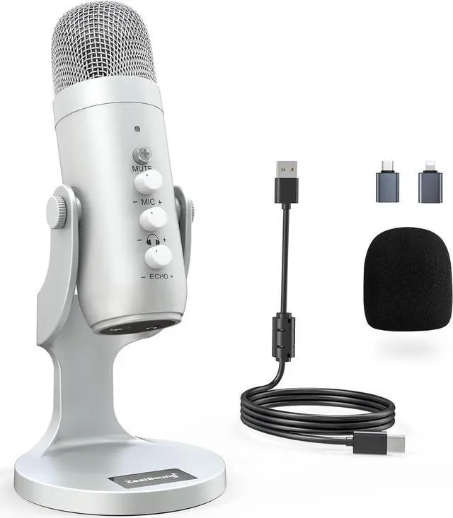 Included Accessory Package1 x Solid built metal construction and anti-vibration stand base (avoid moving); 1 x Durable and professional-grade k66 series Silver microphone; 1 x 70.87 inch USB Audio Cable; 1 x Type C Adapter for compatibility with the newest MacBook and other Type C devices (phones, tablets, and PCs); 1 x USB Adapter for iPhone and iPad; 1 x Microphone Foam Windscreen; 1 x User manual; Free technical support for assistance with any inquiries or issues.