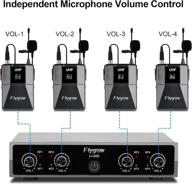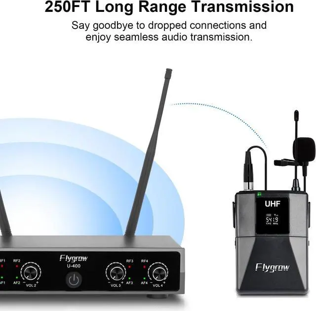 Multi-functional UseOur receiver works up to 250 feet from line of sight in open spaces. Ideal for conferences, broadcasts, weddings, karaoke, social events and any small to medium-sized venues such as conference rooms, auditoriums, schools, churches and small stages. Enjoy an unlimited musical journey with this microphone system.