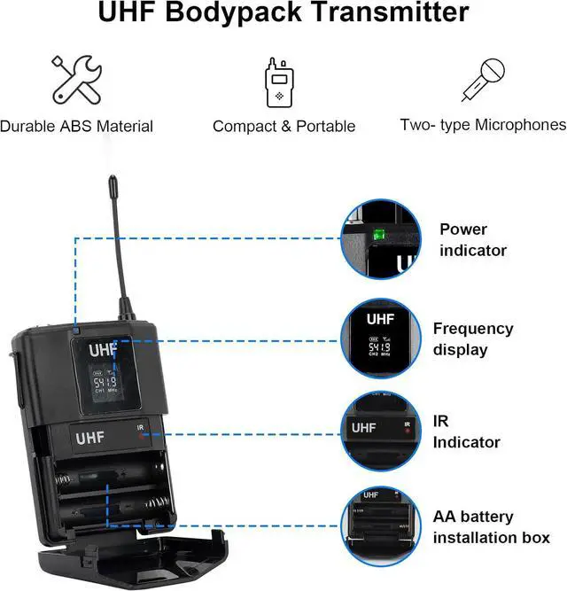 Rugged MaterialHigh-quality ABS shell is specially designed to be impact-resistant and corrosion-resistant. The bodypack transmitter features independent volume control knobs, 2 lavalier microphones, and is lightweight and compact, giving you the freedom to travel to any work location.