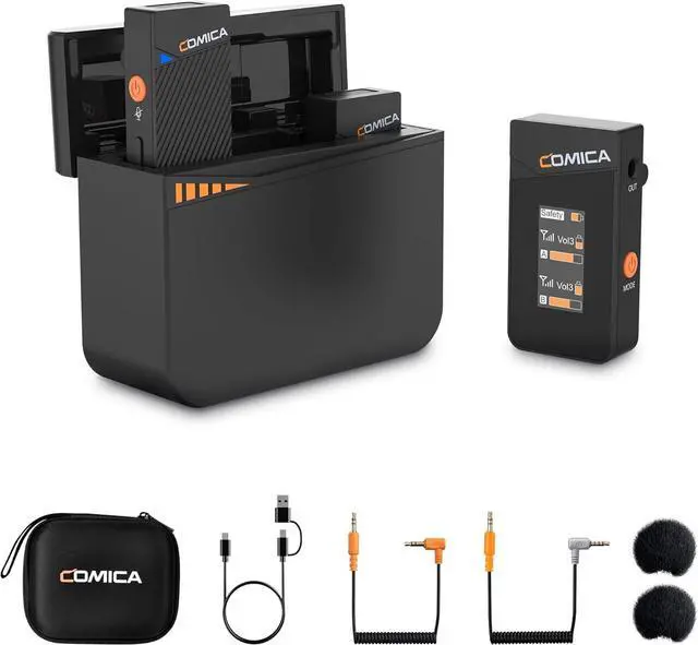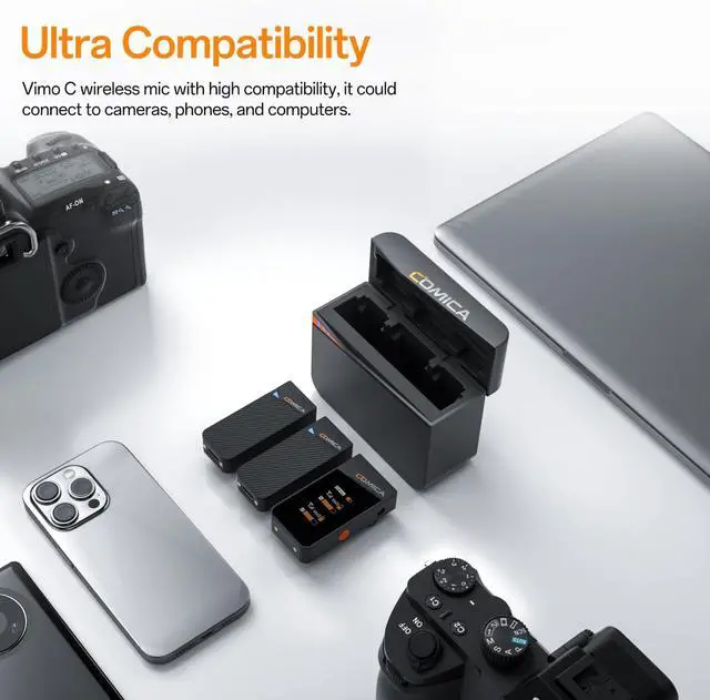 Wide CompatibilityThe Vimo C3 wireless microphone is compatible with all types of devices. It comes with a 3.5 mm TRS to TRS cable for DSLR cameras, and a 3.5 mm TRS to TRRS adapter cable for computers or smartphones with a 3.5 mm port. (Note: 3.5 mm TRS to lightning/USB-C adapter cable not included).