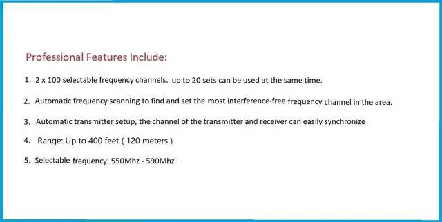 100 Selectable frequencies on each channel, up to 20 sets can be used at the same time