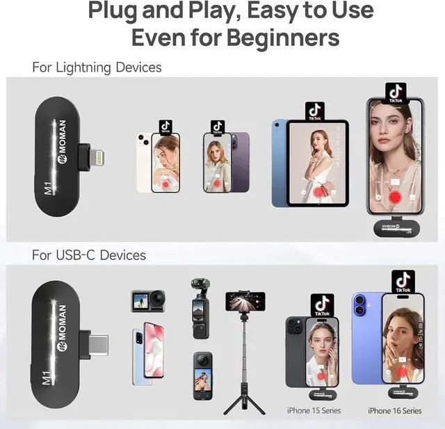 Easy Automatic ConnectionThis cutting-edge wireless lavalier microphone makes it a breeze to set up. No extra equipment, Bluetooth, or Application is needed. Simply plug the receiver into your device and turn on the portable mic, and they will pair up automatically.