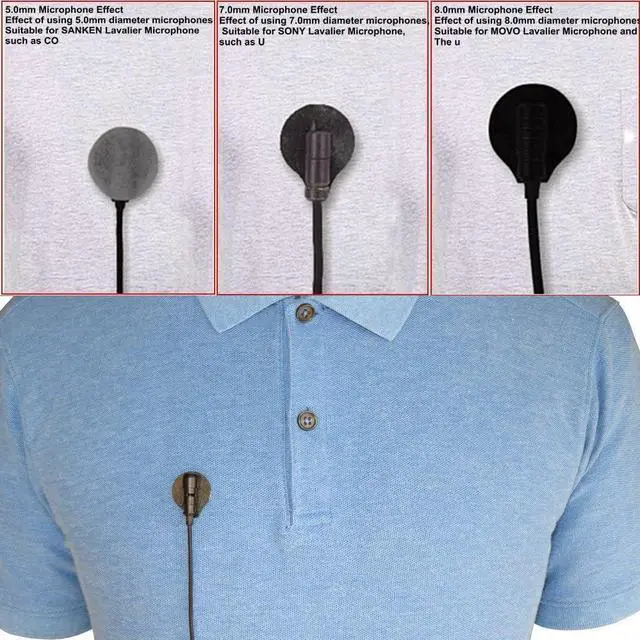 Suitable for The Sticky with diameter of 2.2 mm and Fabric Disc with diameter of 2.5 mm is suitable for the lavalier microphone within 8mm in diameter