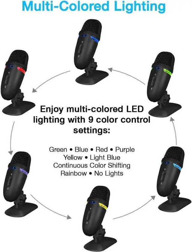 Compact Design: Takes up minimal space and small enough to take with you anywhere. Adjustable angle desk stand and 1.5 m USB cable. The USB mic is threaded on the bottom to use with a different 1/4" threaded mic-stand. Multi-colored lighting with 9 color control settings - Select green, blue, red, purple, yellow, light blue, continuous color shifting, rainbow, or lighting effects off.
