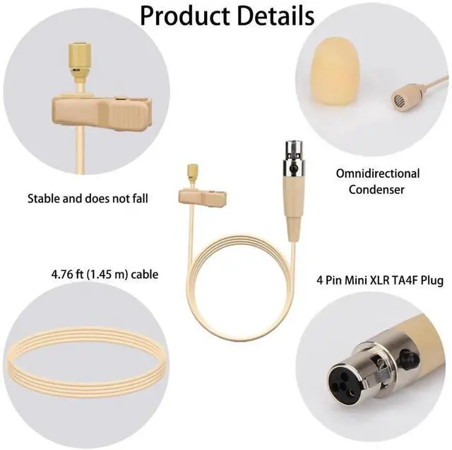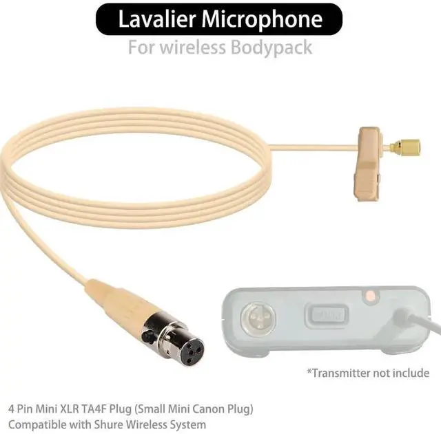 Lavalier Microphone Lapel Microphone, Omnidirectional Condenser mic Compatible with Shure Wireless Bodypack Transmitter, Beige-with 1.45m Cable Mini XLR 4 Pin TA4F Plug