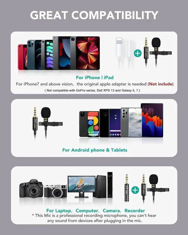 Never Miss it: PoP voice Microphone will be your good choice! Cost-effective lapel microphone. Better than your built-in mic.Updated Features - By the original phone adapter that come with your iphone, PoP voice mic will work on iPhone 12, 12 Pro, on iPhone 11 Pro,11 Pro Max,11, on iPhone XS, XS Max, on iPhone XR, X, 8, 8 Plus, 7, 7Plus, 6, 6S. Note: It is compatible with iPhone. Just Make Sure You Have The "Original Phone Adapter". Microphone does not include that adapter.