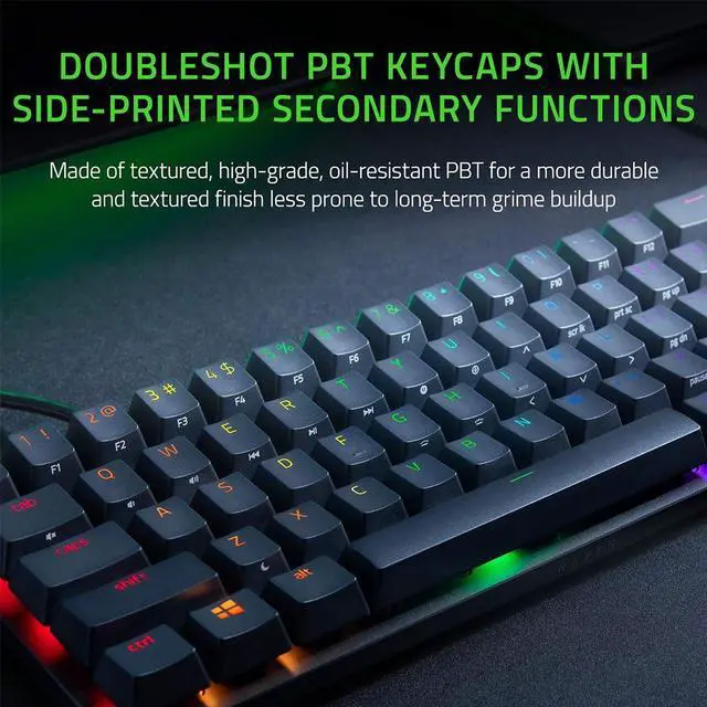 The Razer Huntsman Mini doesnt have the function row, home cluster and numpad of a traditional full-sized keyboard, yet loses no functionality because all these inputs are still accessible via secondary functions and shortcuts. Ideal for minimalist or smaller setups where desk space is a premium, its compact build also means it travels well and is easier to position when gamingallowing you to play more comfortably. Doubleshot PBT Keycaps