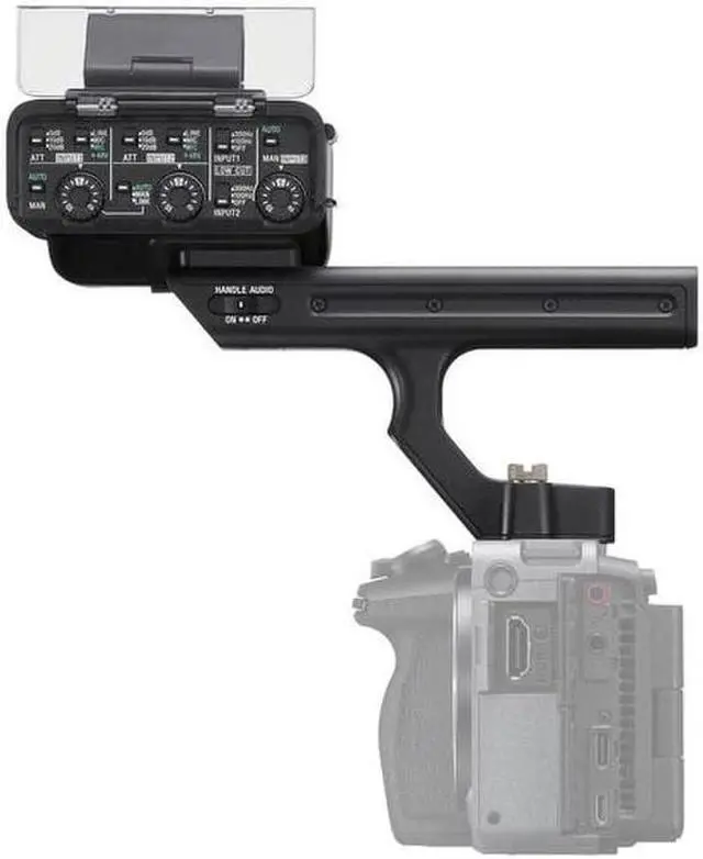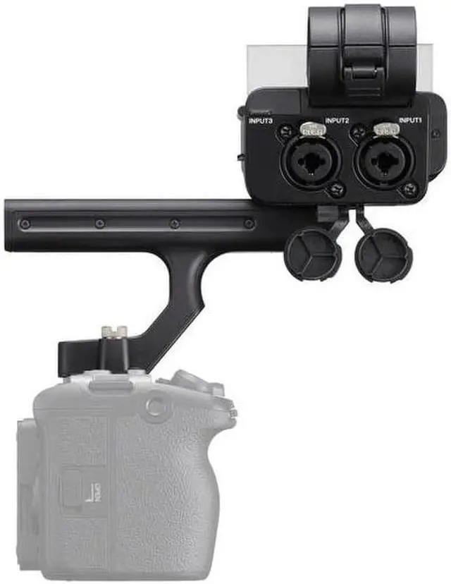 The Sony XLR-H1 Top Handle Unit adds two full XLR inputs and allows more ergonomic handling of your FX3 or FX30. It has two XLR/TRS combo inputs along with a 3.5mm mic input. For easier operation, the handle has physical controls and dials located on the side with covers to prevent accidental changes in the middle of a take. There is a microphone holder that can be used to mount a shotgun microphone to your system. It securely mounts to the camera's Multi Interface Shoe with two screws. Additionally, there are three 1/4"-20 accessory mounting threads.