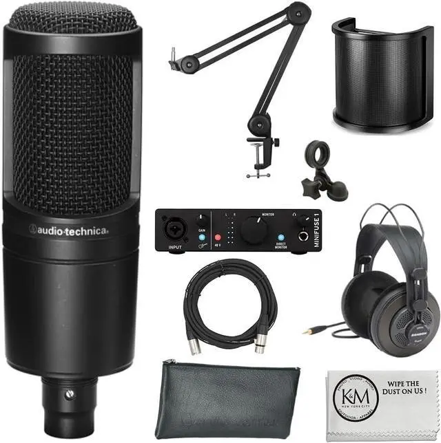ElementFixed-charge back plate, permanently polarized condenserPolar PatternCardioidFrequency Response20-20,000 HzOpen Circuit Sensitivity-37 dB (14.1 mV) re 1V at 1 PaMaximum Input Sound Level144 dB SPL, 1 kHz at 1% T.H.D.Noise20 dB SPLDynamic Range124 dB, 1 kHz at Max SPLSignal-to-Noise Ratio74 dB, 1 kHz at 1 PaPhantom Power Requirements48V DC, 2 mA typicalWeight12.1 oz (345 g)Dimensions6.38" (162.0 mm) long, 2.05" (52.0 mm) maximum body diameterOutput ConnectorIntegral 3-pin XLRM-type AT2020 Overview AT2020 Overview Cardioid Pattern Condenser XLR Output Side-address Microphone Perfect Mic for Creators ITEMS INCLUDED IN THIS BUNDLE MiniFuse 1 Portable 1x2 USB Type-C Audio Interface | Black SR850G Professional Studio Reference Open Ear Headphones | Graphite Edition Microphone Suspension Boom Arm XLR Cable for Connecting Microphone U-Shape Pop Filter Shield Pouch and Stand Adapter Specifications