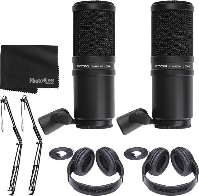 THIS TOP VALUE KIT INCLUDES: 2x Zoom ZDM-1 Dynamic Microphone - 2x Broadcast/Webcast Boom Arm with XLR Cable - 2x Sets of Stereo Headphones (Black) - Photo4Less Black Cleaning Cloth