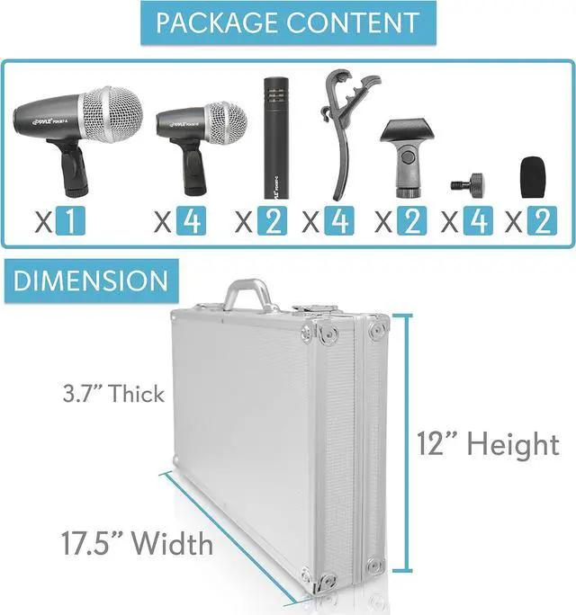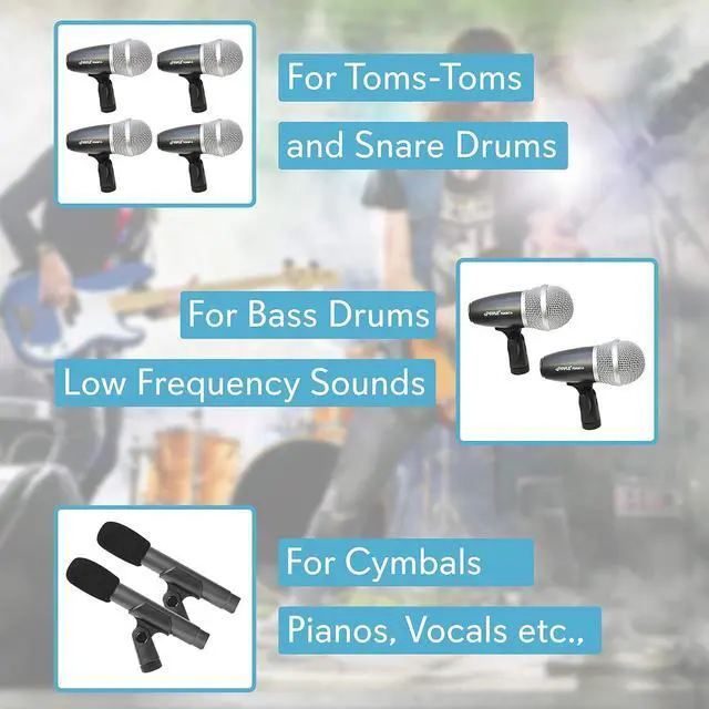 Product DescriptionThis seven-microphone wired drum kit from Pyle Pro is everything you need to record your drums discretely for a full, powerful sound. Hear the ring of the cymbals, the punch of the snares, and the boom of the kick drum, all with independent mics. This kit includes a high-performance microphone specially tuned to capture low-end punch as well as sensitive, flat response mics ideal for overhead and cymbal reproduction. It comes with a set of drum mounts that can be used on most standard drum rims. Uses standard XLR connectors. Includes windscreens and carrying case.