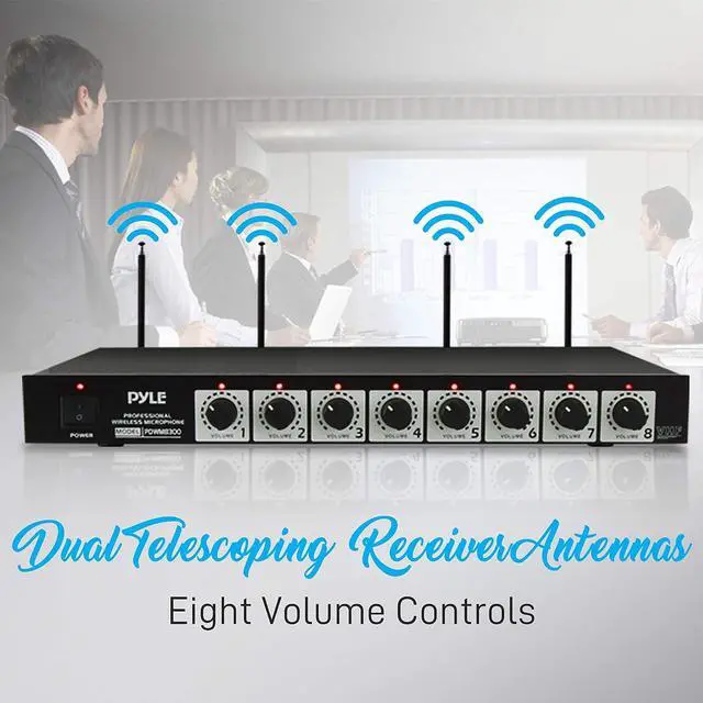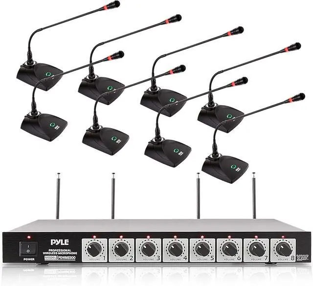 Accessories include power supply and eight batteries for each wireless microphone Comes with Eight Wireless Tabletop MicrophonesThis unit comes with eight microphones which are great for large performances or events. Each microphone has its own volume dial on the base unit so you can balance the vocals as desired.