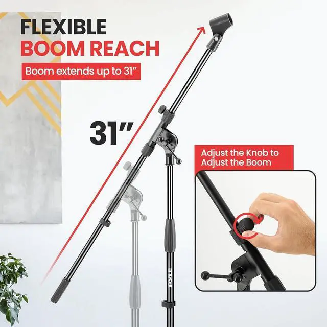 Introducing the Tripod Microphone Stand with a 31" Boom, a versatile and reliable solution for your recording or live performance needs. This microphone stand boasts an impressive set of features designed to enhance your audio setup. Its boom arm extends up to 31 inches, providing ample reach to position your microphone exactly where you need it. Fast and smooth adjustments are made easy with the knob boom adjustment mechanism, ensuring precise positioning for your microphone. With its sleek gloss black finish and sturdy yet lightweight tubing construction, this stand combines both style and durability. Plus, it comes complete with a microphone holder (microphone not included), making it a convenient all-in-one solution for musicians, podcasters, and audio enthusiasts. The stand's compact dimensions of 3.5" x 3.5" x 38" inches make it a portable and space-efficient addition to your setup. Elevate your sound recording experience with the Tripod Microphone Stand with 31" Boom.