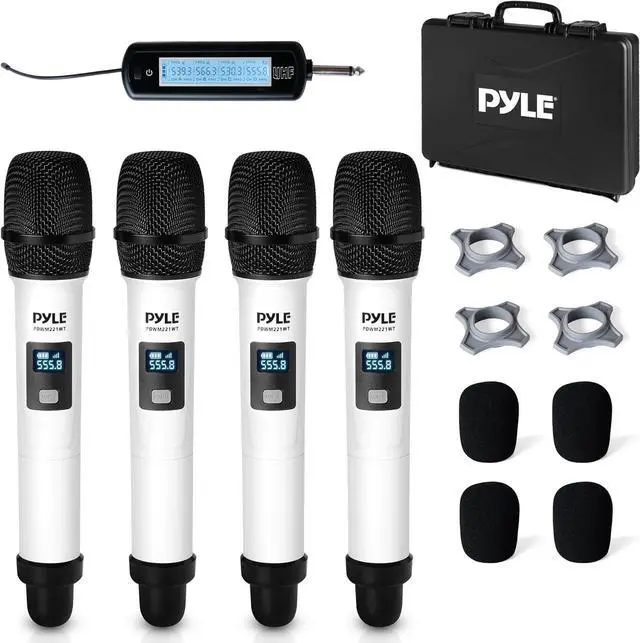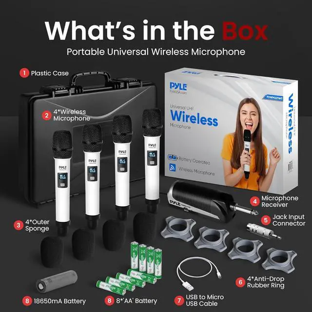 COMPLETE ACCESSORY KIT Comes with 4 wireless microphones, 8 AA batteries, anti-drop rubber rings, microphone sponges, microphone receiver, 3.5mm audio input connector, USB charging cable, and a protective plastic carrying case for easy transport.