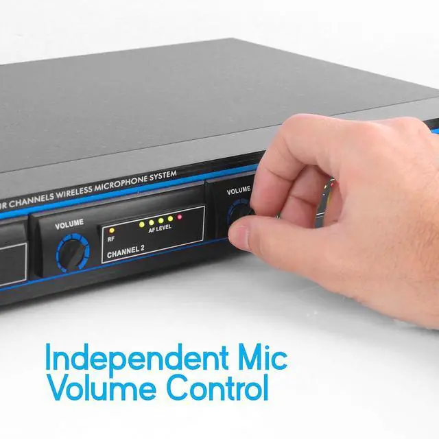 INDEPENDENT MIC VOLUME CONTROL: The unit has an independent adjustable volume control for each channel so you can balance the vocals as desired. Perfect for professional engagements, conference, PA, DJ party