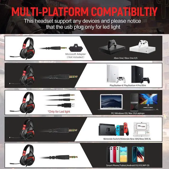 ?MULTI-PLATFORM COMPATIBLE: Equipped with 3.5mm Plug, support PlayStation 4, Xbox One(Need Microsoft Adapter (not including)), PC, Laptop, Tablet, iPad, Computer, Mobile Phone and other devices with 3.5 MM jack.