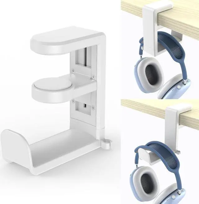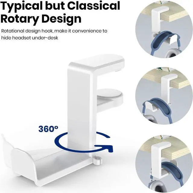 Intuitive rotating hanger allows for convenient under desk storage and easy access by swinging the hook forward from under the desk.