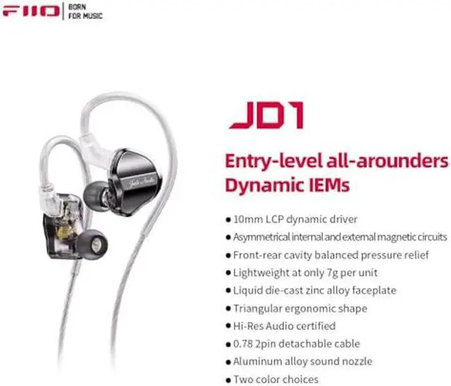 JD1 adopts 10mm diameter dual- cavity magnetic high-performance dynamic driver, and the whole LCP (Liquid Crystal Polymer) liquid crystal diaphragm to bring excellent transient response and high-resolution sound details.