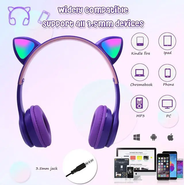 WIRELESS & WIRED KIDS HEADPHONES: This on-ear kids headphones adopts the bluetooth 5.0 version, also come with a 3.5mm jack audio cable. You can use them as both wireless headphones and wired headphones, very convenient expecially when out of power. The 3.5mm jack cable supports control from various devices like smartphones, tablet, kindle, PC, laptop, TV and music players. (Note: If you use a 3.5MM cable, the cat ears will not light up and the button function cannot be used)