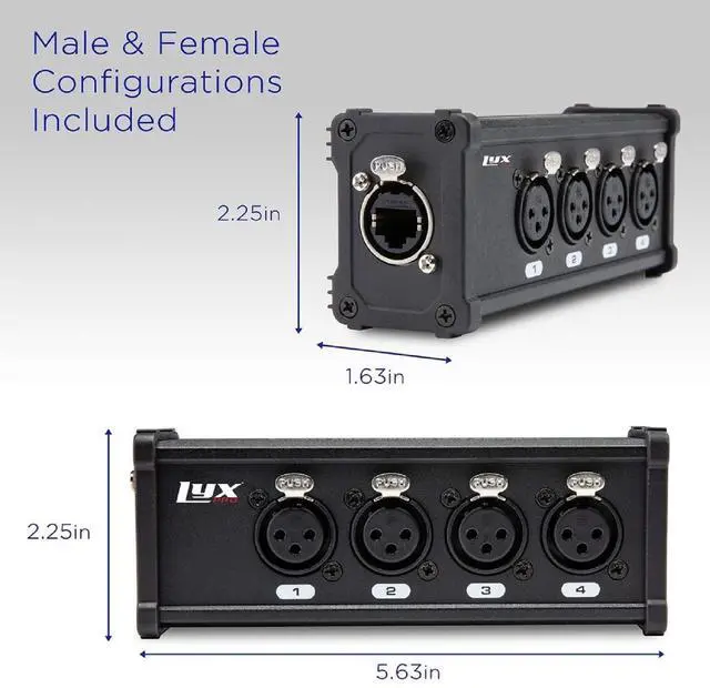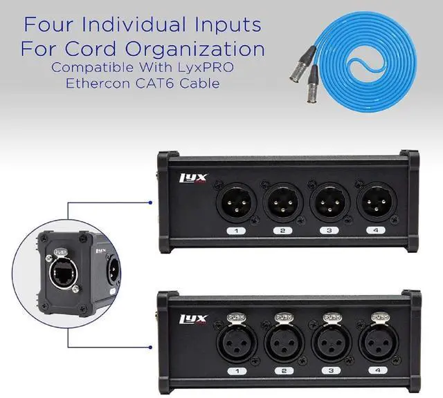 VERSATILE XLR BREAKOUT: 4 CH. 3 PIN FOR STAGE SOUND, LIGHTING, RECORDING STUDIO : Ideal for a wide range of applications including stage sound, lighting, and recording studio settings. With 4 channels and 3 pins, this XLR cable breakout can be used to connect a variety of audio devices to a single Cat 6 network cable up to 330 ft long.
