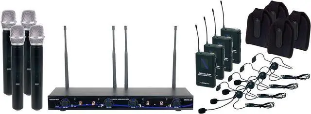 Each receiver comes packaged with wireless handheld microphones as well as Body pack transmitter with headset microphone and instrument Cable for added versatility