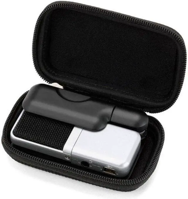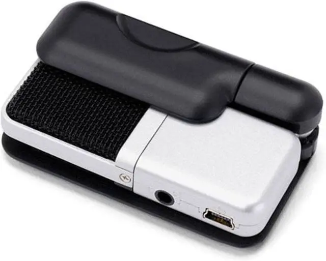 Go Mic's custom, compact design clips onto a laptop or sits upright on a desk, & includes a USB cable, cable clip, mic stand mount, & carry case