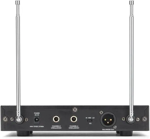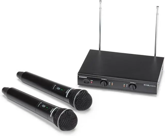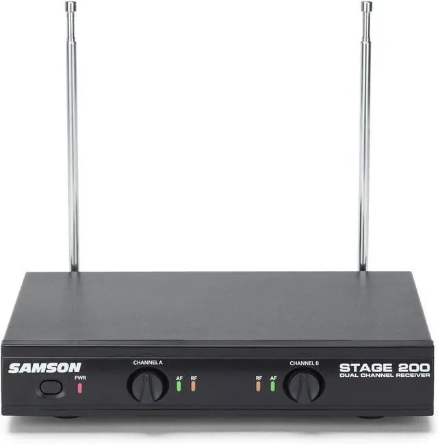 Dual-channel VHF wireless system Fixed frequency design for instant setup Two frequency bands (region dependent) support up to four performers simultaneously 1/4" audio cables and AC adapter included