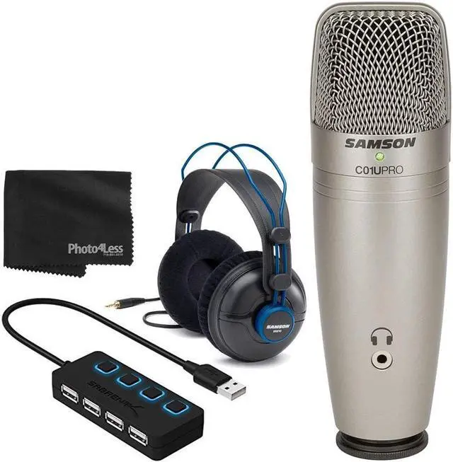 THIS PHOTO4LESS TOP VALUE ACCESSORY KIT INCLUDES: Samson C01U PRO USB Studio Condenser Microphone - 4-Port USB 2.0 Hub - Studio Monitor Headphones - Photo4Less Cleaning Cloth