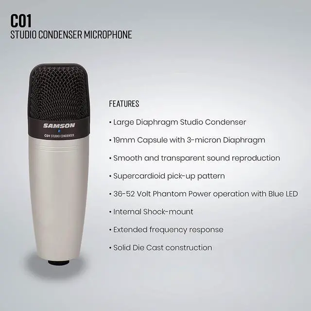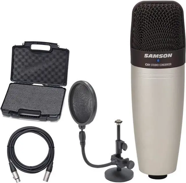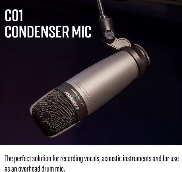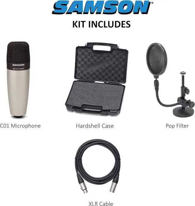INCLUDES: Samson C01 Large Diaphragm Condenser Microphone, Samson Desktop Mic Stand / Metal Pop Filter Bundle MDPS05, Mic Cable XLR-M to XLR-F .