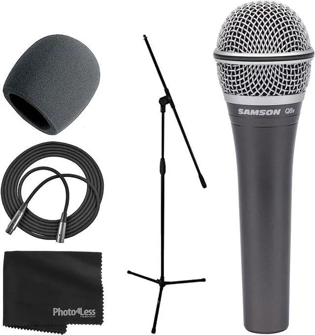 This Top Value Kit includes: Samson Q8x Dynamic Supercardiod Handheld Microphone - On Stage ASWS58B Foam Windscreen - Tripod Base Mic Stand - Mic Cable XLR-M to XLR-F - Black Cleaning Cloth