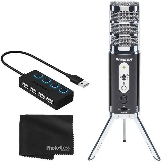 This Photo4Less Top Value Accessories Kit includes: Samson Sattelite USB/iOS Broadcast Microphone - 4-Port USB 2.0 Hub with Individual LED Lit Power Switches - Photo4Less Black Cleaning Cloth