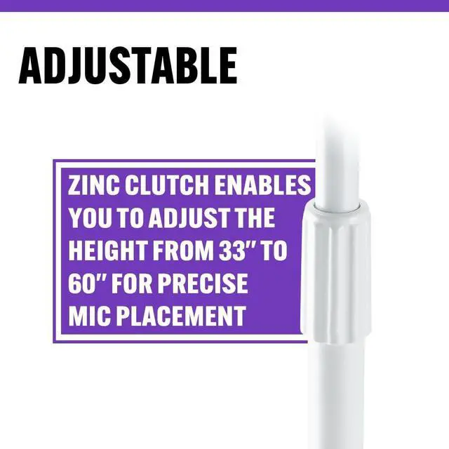 Adjustable. Heavy-duty zinc clutch enables you to adjust the height from 33" to 60" for precise mic placement and to accommodate a wide range of production requirements.
