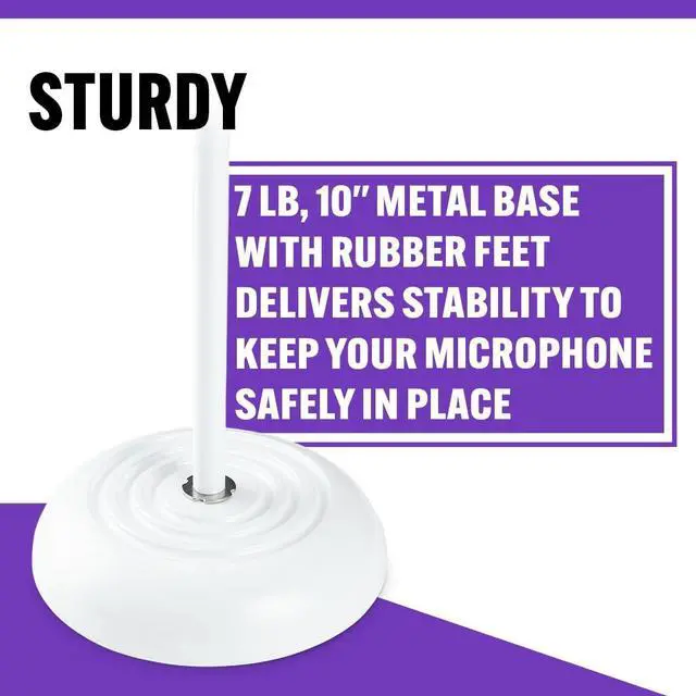 Sturdy. 7 lb, 10" metal base delivers balance and stability while rubber feet reduce vibrations and increase grip to prevent skids and keep your microphone safely in place.