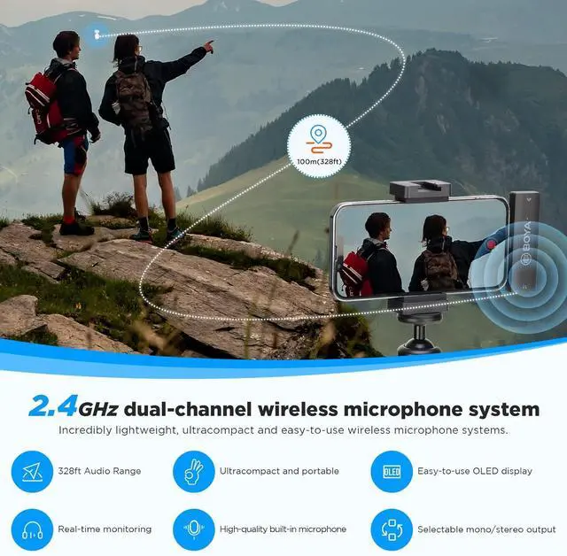 328FT STABLE SIGNAL TRANSMISSION --- BOYA wireless lavalier microphone BY-XM6 uses the 2.4Ghz transmission frequency band and can support up to 328ft of barrier-free transmission distance, and take the hassle out of being bound by wires.