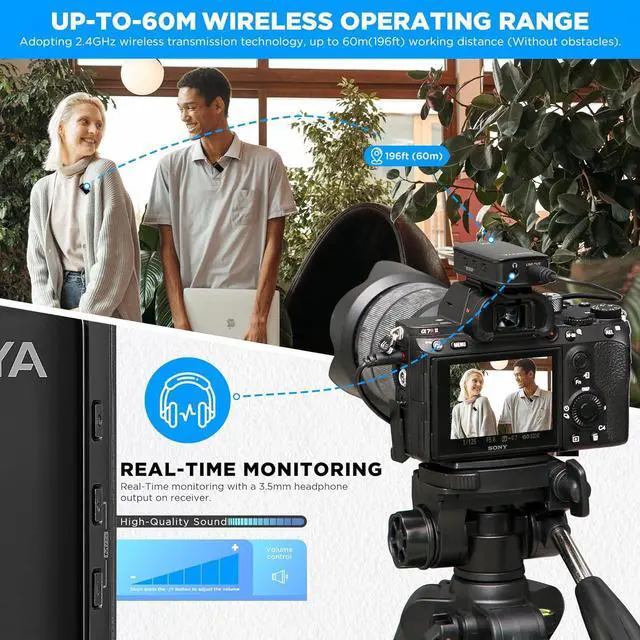 Real-time monitoring and mute function The receiver has a real-time monitoring 3.5 mm headphone monitoring jack to ensure the smoothness of the recording; in addition, the mute function can be flexibly adjusted according to the recording environment to get the desired recording effect.