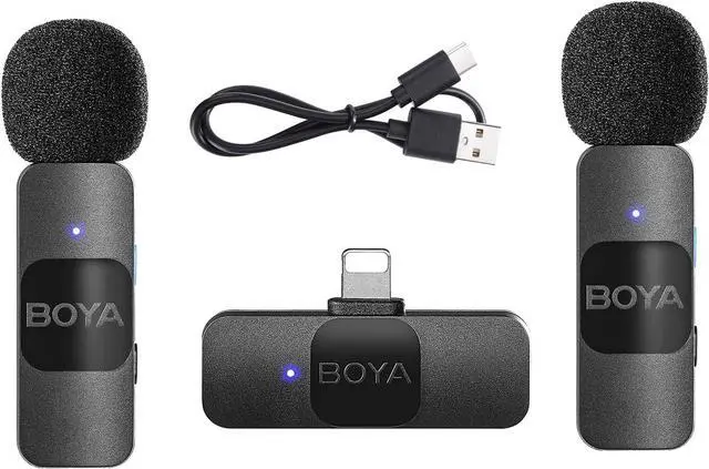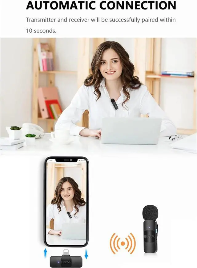 Wireless Microphone SystemThis wireless microphone system adopts 2.4G wireless transmission technology, supports auto pairing, plug-and-play, no APP needed, very suitable for phone vlog, live streaming, interview, online chatting, etc.