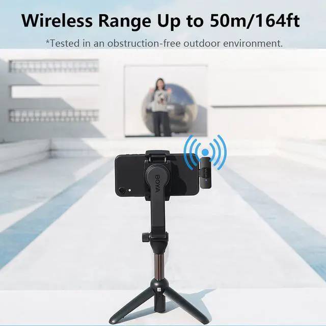 Long Distance and Clear TransmissionUp to 50M effective transmission helps you to realize long-distance recording easily. Built-in smart noise reduction module, the wireless microphone can effectively filter out the noise to improve sound quality by turning on the NR function.