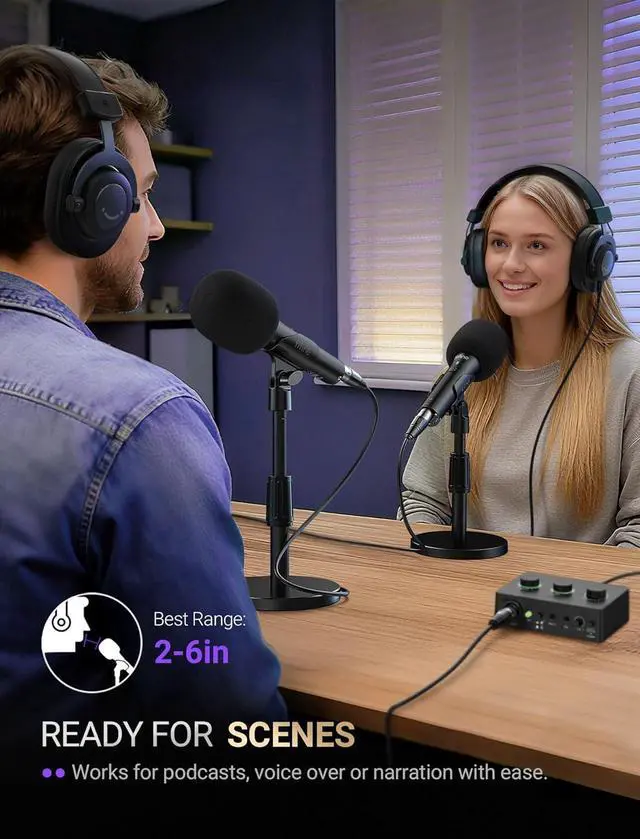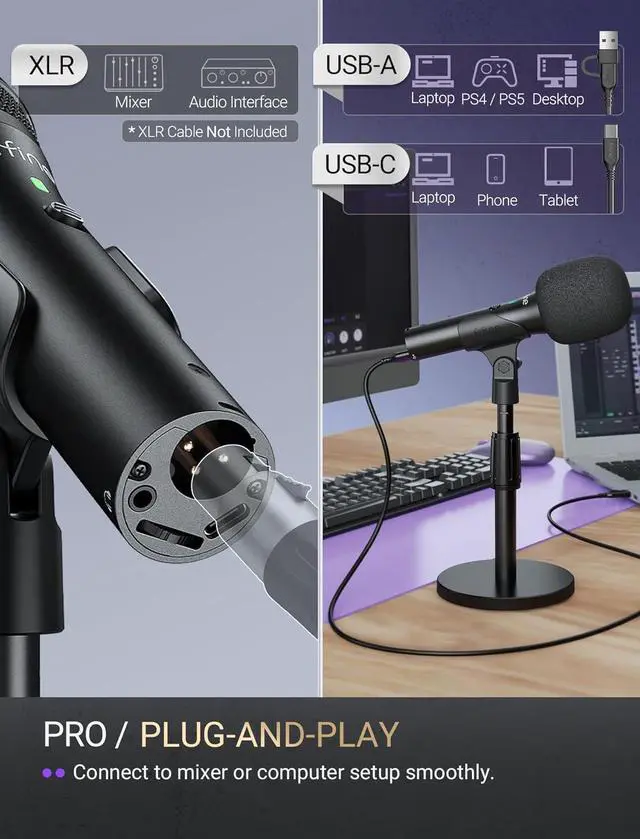 [Dual-Studio Connectivity] The dynamic podcast microphone give you a way to switch between USB plug-and-play simplicity and XLR pro-audio quality, which suit for a wide range of applications. You can record podcast drafts via USB on your desktop or laptop, then connect XLR to your audio interface for final takes without changing mics.