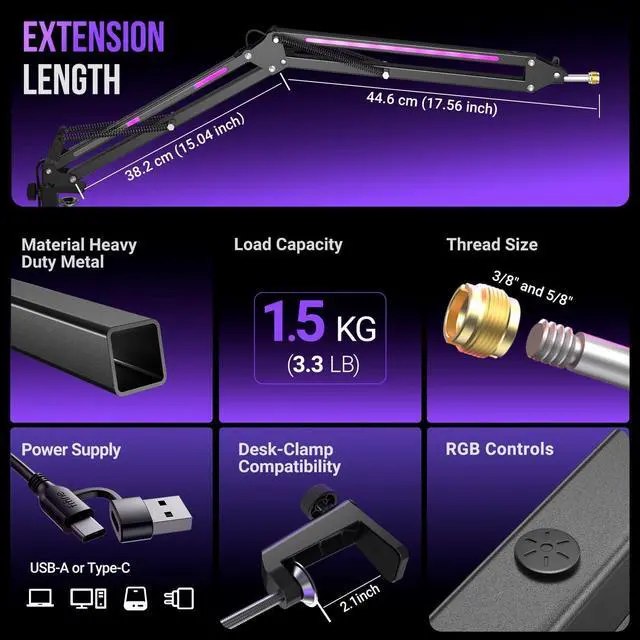[Controllable RGB Modes-Switch at Will] Level up your desk aesthetic with over 9 RGB lighting effects of gaming mic arm. You can control the modes and colors via RGB button on the microphone stand boom arm (Long-press 5s to turn on/off; Short-press to switch) for advanced sync options. Smart RGB sync with colorful modes to match your gameplay or mood, creating immersive glow lighting experience.
