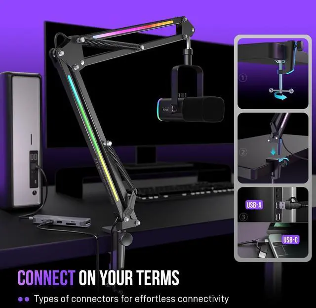 [Two Thread Adapters-Universal Compatibility] Our FIFINE microphone arm with RGB comes with 3/8 thread screw and 5/8 screw adapter, ensuring plug-and-play compatibility with most of microphones right out of box. Help you get rid of the compatibility headache of repeated returns and failed mounting for good.