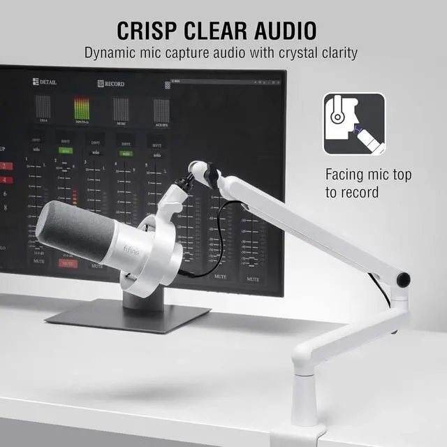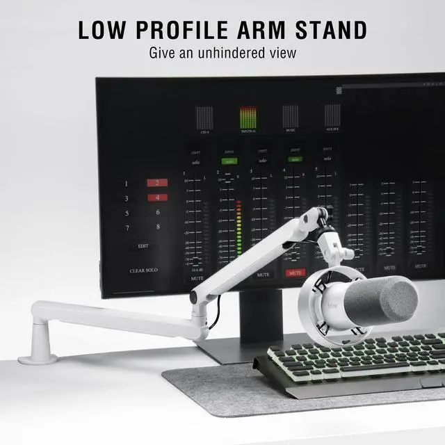 [Low Profile Style and Sturdy Metal] Sleek and space-saving design ensures the boom arm mic stand pack fits seamlessly into recording or podcasting environment. The microphone arm stand bundle with dynamic mic extends from the bottom of screen, maintaining a clean and unobstructed workspace. The microphone boom arm kit boasts a robust metal construction that stands as a fortress of support for your microphone and ensure vibration-free recordings.