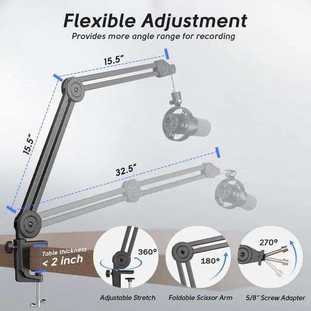 Flexible Adjustment-Every joint on the dynamic microphone arm stand bundle provides a wide angle adjustment range. You can stretch it vertically for 180° or horizontally for 135°. Sufficient flexibility and extension allow you to adjust recording posture at will for a better angle to produces more touching and resonant audio.