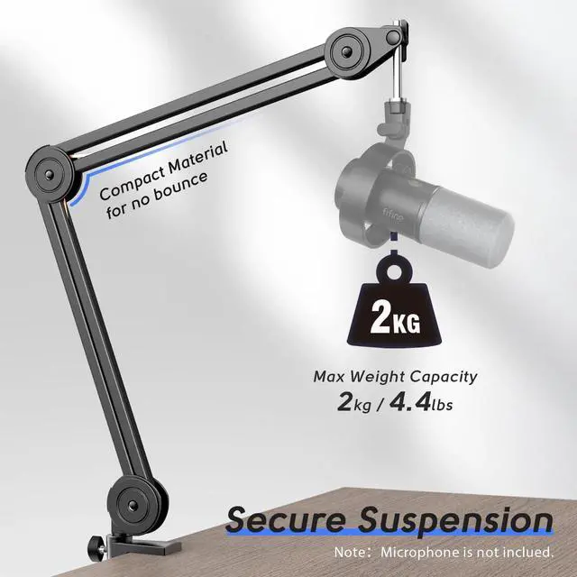 LARGE CAPACITY-Made of sturdy metal, the scissor arm tube is wide and thick enough. Multi-reinforced designs make the weight capacity of arm stand up to 2 kg. The compact and strong boom arm gives your microphone secure hold to reduce violent shaking from intense gaming operation or bump and hit.