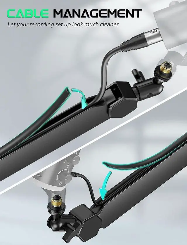 [Cable Management Channels] The microphone suspension boom arm pack reconfigured cable management channels optimize the microphone cable storage. You can quickly remove the cover to put and organize the cable. The process is straightforward and make your recording environment tidy.