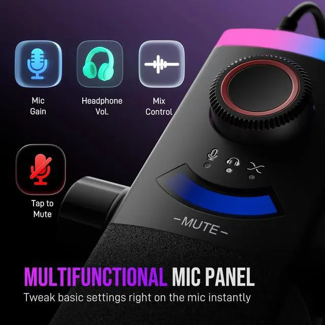 [Monitoring and Multifunctional Dial] Monitor your vocal mic and PC audio together in real-time no guessing. Adjust the Mix Control to balance the rhythm of background music and commentary when Let's Play, or lower mic level to focus on muffled podcast co-hosts. The silent 3-in-1 knob can be fine-tuned gain and headphone volume on the USB microphone with boom arm.